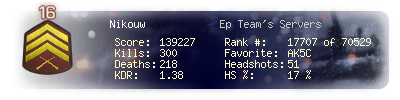 | Kills | 300 | Deaths | 218 | Kill / Death | 1.38 |