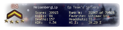 | Headshots | 33 | Suicides | 3 | Headshot / Kill | 39.29 % |