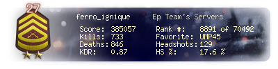 | Headshots | 129 | Suicides | 11 | Headshot / Kill | 17.6 % |