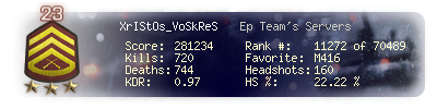 | Headshots | 160 | Suicides | 8 | Headshot / Kill | 22.22 % |