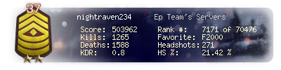 | Headshots | 271 | Suicides | 17 | Headshot / Kill | 21.42 % |