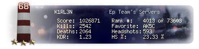 | Headshots | 593 | Suicides | 19 | Headshot / Kill | 23.33 % |