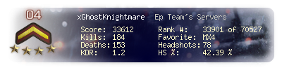 | Headshots | 78 | Suicides | 3 | Headshot / Kill | 42.39 % |