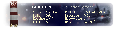 | Headshots | 180 | Suicides | 10 | Headshot / Kill | 18.04 % |