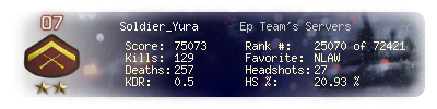 | Headshots | 25 | Suicides | 5 | Headshot / Kill | 20.16 % |