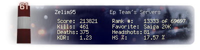 | Headshots | 81 | Suicides | 8 | Headshot / Kill | 17.57 % |
