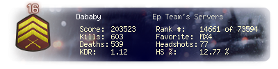 | Headshots | 77 | Suicides | 9 | Headshot / Kill | 12.77 % |