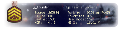 | Headshots | 109 | Suicides | 13 | Headshot / Kill | 16.01 % |