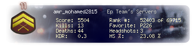 | Headshots | 3 | Suicides | 0 | Headshot / Kill | 27.27 % |