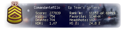 | Headshots | 187 | Suicides | 7 | Headshot / Kill | 24.8 % |
