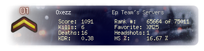 | Headshots | 1 | Suicides | 0 | Headshot / Kill | 16.67 % |