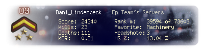 | Headshots | 3 | Suicides | 0 | Headshot / Kill | 13.04 % |