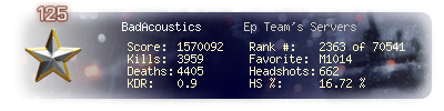 | Headshots | 62 | Suicides | 8 | Headshot / Kill | 16.99 % |