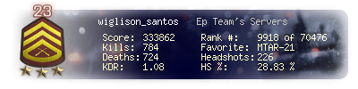 | Headshots | 226 | Suicides | 13 | Headshot / Kill | 28.83 % |