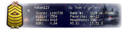 | Headshots | 81 | Suicides | 16 | Headshot / Kill | 13.11 % |