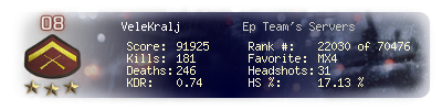 | Headshots | 31 | Suicides | 8 | Headshot / Kill | 17.13 % |