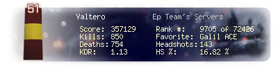 | Headshots | 143 | Suicides | 5 | Headshot / Kill | 16.82 % |