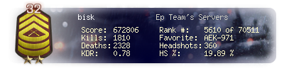 | Headshots | 51 | Suicides | 10 | Headshot / Kill | 15.55 % |