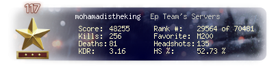 | Headshots | 135 | Suicides | 5 | Headshot / Kill | 52.73 % |