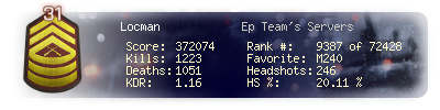 | Headshots | 246 | Suicides | 6 | Headshot / Kill | 20.11 % |