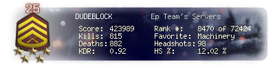 | Headshots | 98 | Suicides | 6 | Headshot / Kill | 12.02 % |