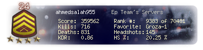| Headshots | 145 | Suicides | 6 | Headshot / Kill | 20.25 % |