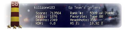 | Headshots | 33 | Suicides | 2 | Headshot / Kill | 16.42 % |