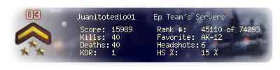 | Headshots | 6 | Suicides | 0 | Headshot / Kill | 15 % |