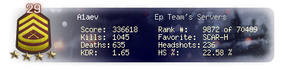 | Headshots | 236 | Suicides | 5 | Headshot / Kill | 22.58 % |