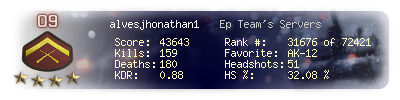 | Headshots | 51 | Suicides | 0 | Headshot / Kill | 32.08 % |