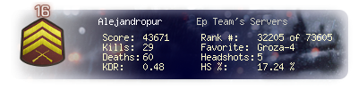 | Headshots | 5 | Suicides | 0 | Headshot / Kill | 17.24 % |