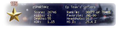 | Headshots | 16 | Suicides | 1 | Headshot / Kill | 25.4 % |