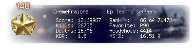 | Headshots | 4538 | Suicides | 98 | Headshot / Kill | 16.46 % |
