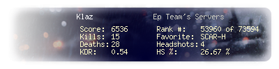 | Headshots | 4 | Suicides | 0 | Headshot / Kill | 26.67 % |