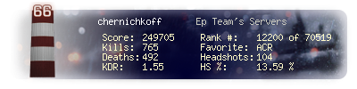| Headshots | 104 | Suicides | 16 | Headshot / Kill | 13.59 % |