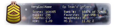 | Headshots | 53 | Suicides | 18 | Headshot / Kill | 11.65 % |