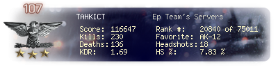 | Kill-streak | 15 | Death-streak | 7 | Team Kills | 0 |