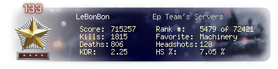 | Headshots | 133 | Suicides | 47 | Headshot / Kill | 7.09 % |