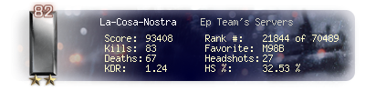 | Headshots | 27 | Suicides | 5 | Headshot / Kill | 32.53 % |