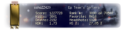 | Headshots | 929 | Suicides | 47 | Headshot / Kill | 27.13 % |