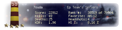 | Headshots | 3 | Suicides | 1 | Headshot / Kill | 7.69 % |
