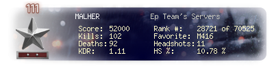 | Headshots | 11 | Suicides | 6 | Headshot / Kill | 10.78 % |