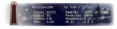 | Headshots | 8 | Suicides | 4 | Headshot / Kill | 8.6 % |