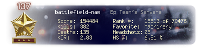 | Headshots | 26 | Suicides | 5 | Headshot / Kill | 6.81 % |