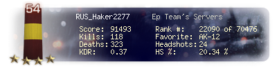 | Headshots | 24 | Suicides | 13 | Headshot / Kill | 20.34 % |