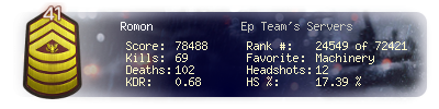 | Headshots | 12 | Suicides | 0 | Headshot / Kill | 17.39 % |