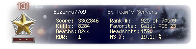 | Headshots | 2945 | Suicides | 407 | Headshot / Kill | 19.09 % |