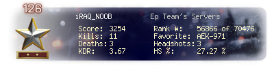 | Headshots | 3 | Suicides | 0 | Headshot / Kill | 27.27 % |