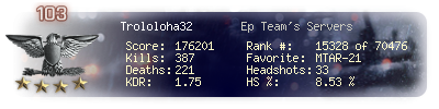 | Headshots | 33 | Suicides | 5 | Headshot / Kill | 8.53 % |