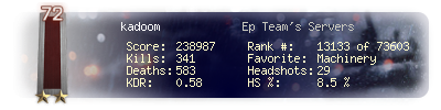 | Headshots | 29 | Suicides | 14 | Headshot / Kill | 8.5 % |